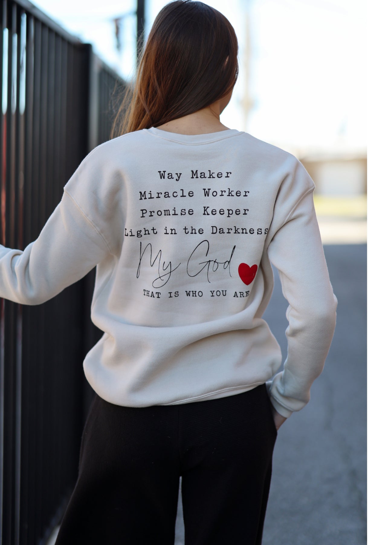 Wrap yourself in comfort and inspiration with the Waymaker Sweatshirt. This unbelievably soft and cozy pullover feels like a warm hug — perfect for cool mornings, worship nights, or everyday wear. Featuring a sweet heart graphic with “Waymaker” on the front and the powerful Waymaker lyrics on the back, it’s a beautiful reminder of faith and hope wherever you go.
