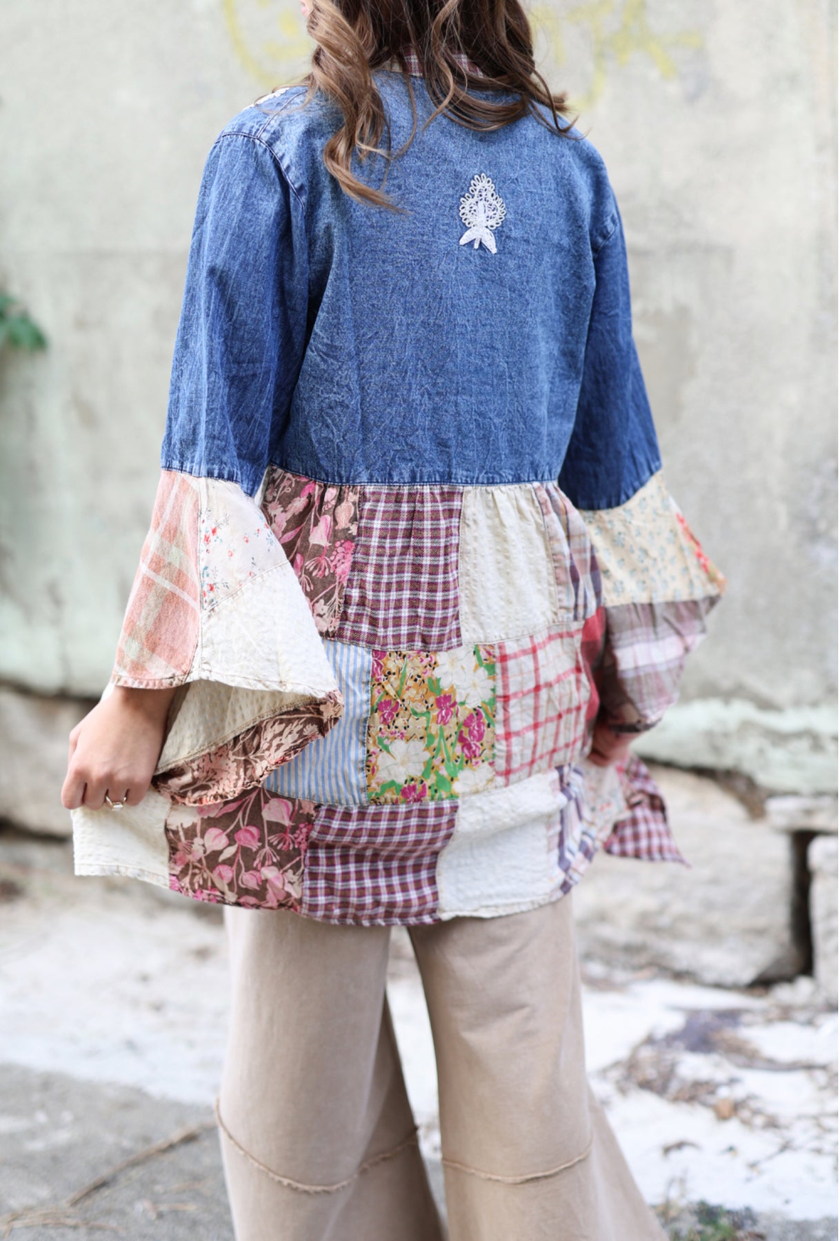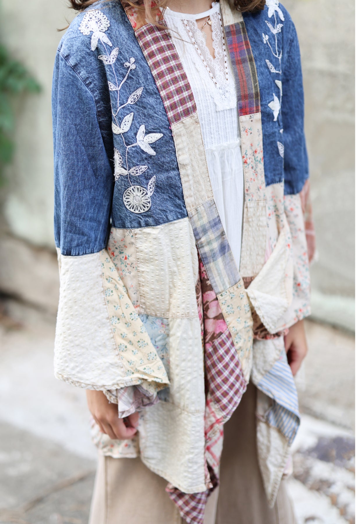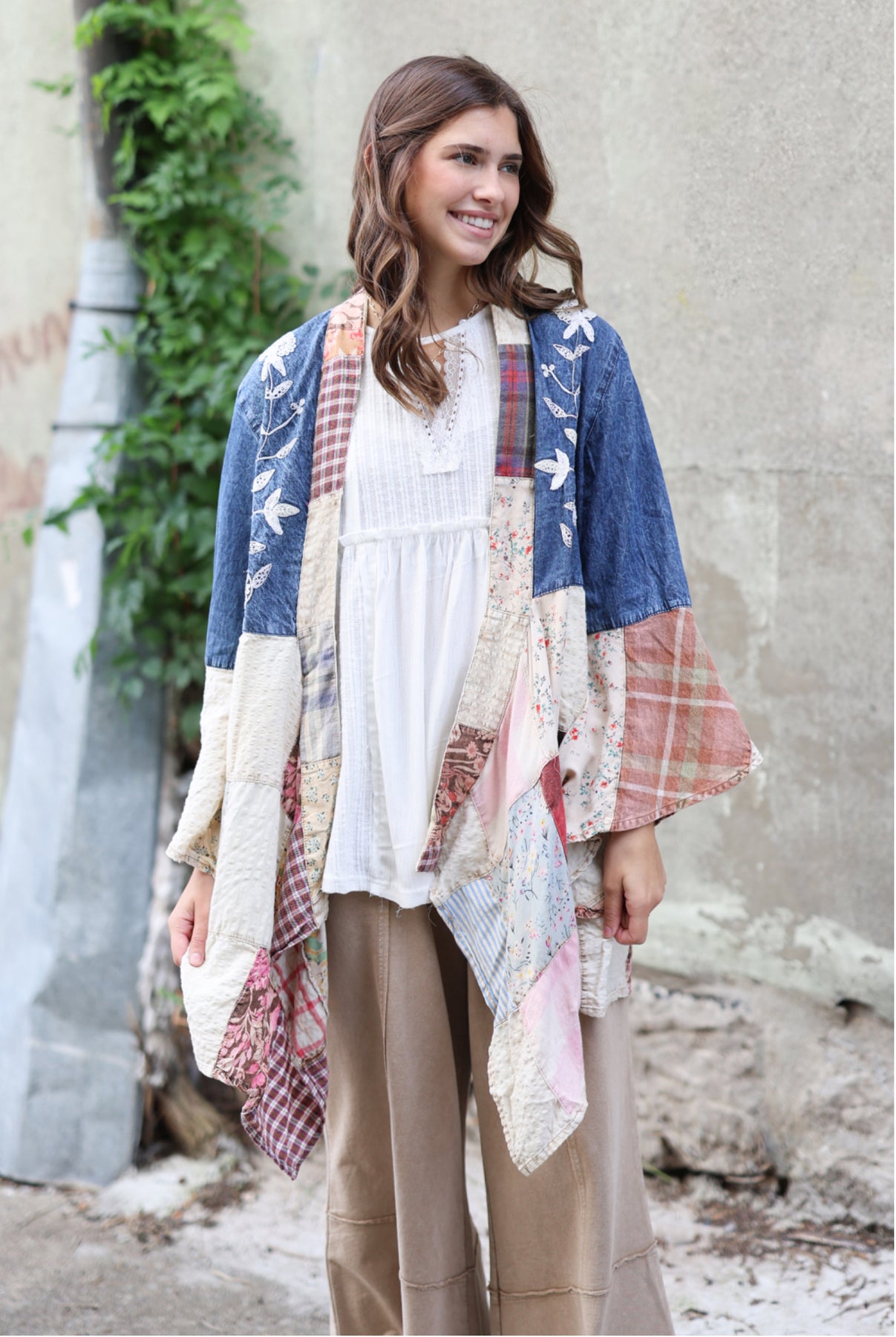 A true one-of-a-kind layer for the season, the Autumn Fields Duster blends cozy patchwork charm with classic denim accents. This long, flowy piece features quilt-inspired panels in warm fall tones and playful florals, paired with denim at the shoulders and sleeves embroidered with delicate white florals. Crafted from 100% cotton, it’s lightweight yet full of character—perfect for throwing over jeans, dresses, or leggings when you want to make a statement.