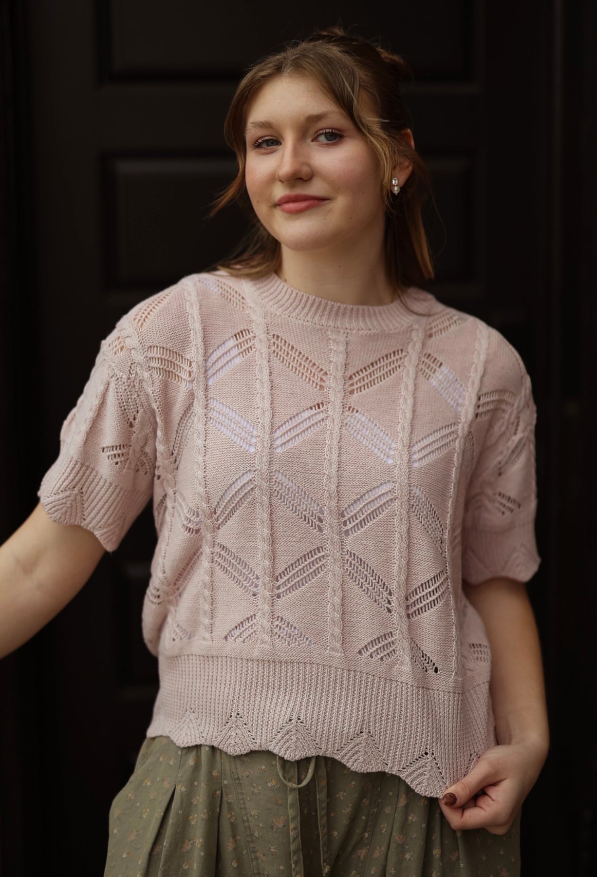 Soft, feminine, and effortlessly pretty — the Diamond Pointelle Knit in Blush is the perfect lightweight piece for everyday wear. Crafted from breathable cotton with a delicate diamond pointelle pattern, this sweater adds subtle texture and charm to any outfit. The soft blush hue brings a romantic touch, while the relaxed silhouette makes it easy to style with your favorite skirts, denim, or trousers for a timeless boutique look.