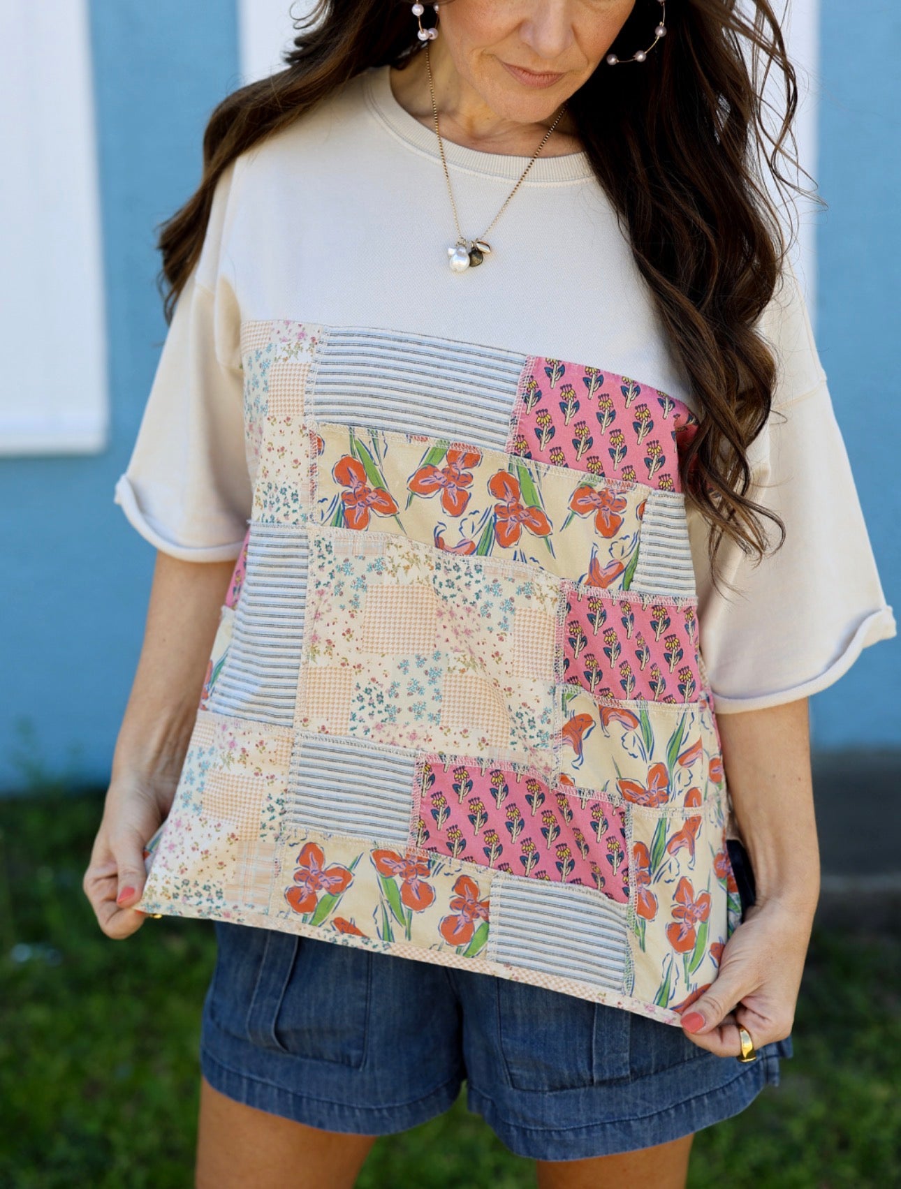 Cozy meets charming in this Khaki Patchwork Top by Easel. Featuring a soft, neutral base with a beautifully mixed patchwork front, this piece feels like a little work of art you can wear. The combination of florals, stripes, and subtle prints gives it that vintage, handmade feel, while the relaxed silhouette keeps it easy and comfortable for everyday wear.