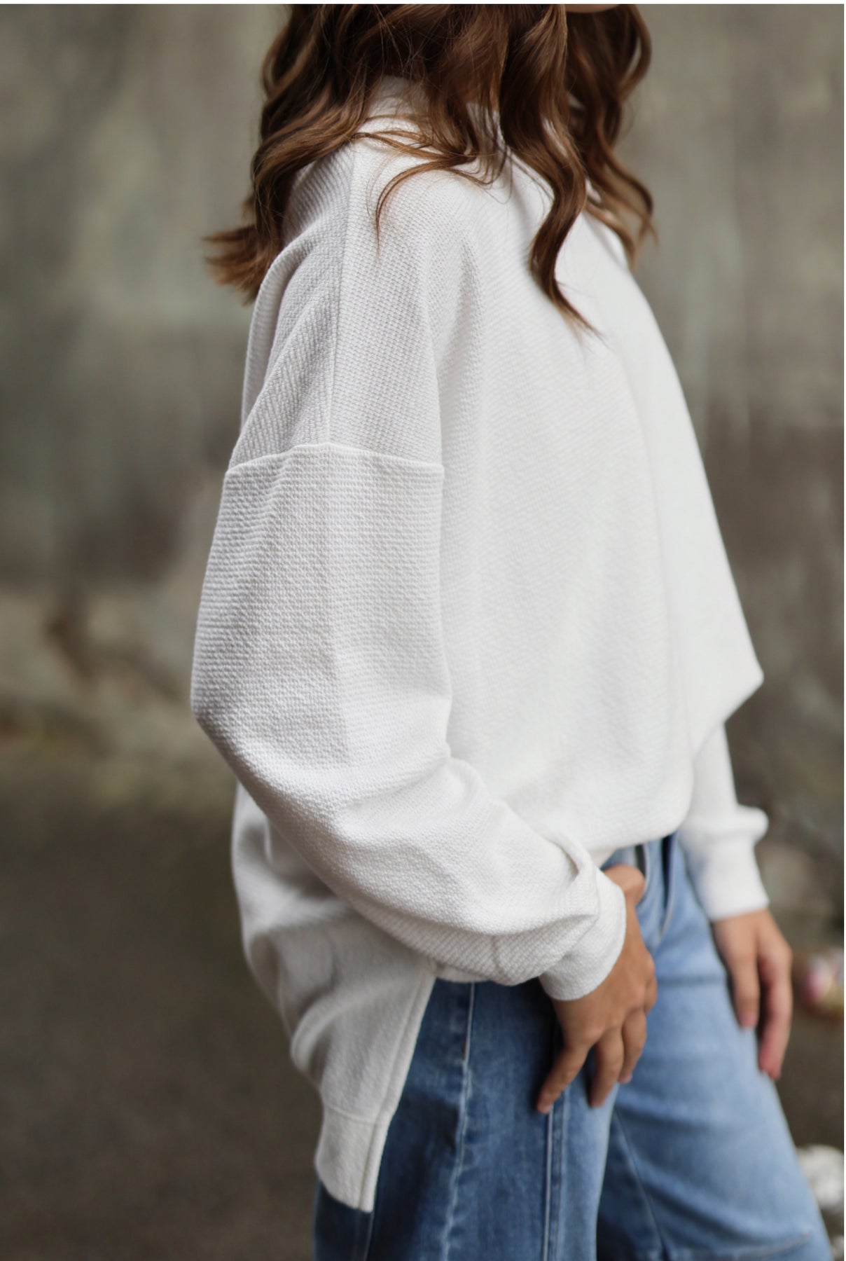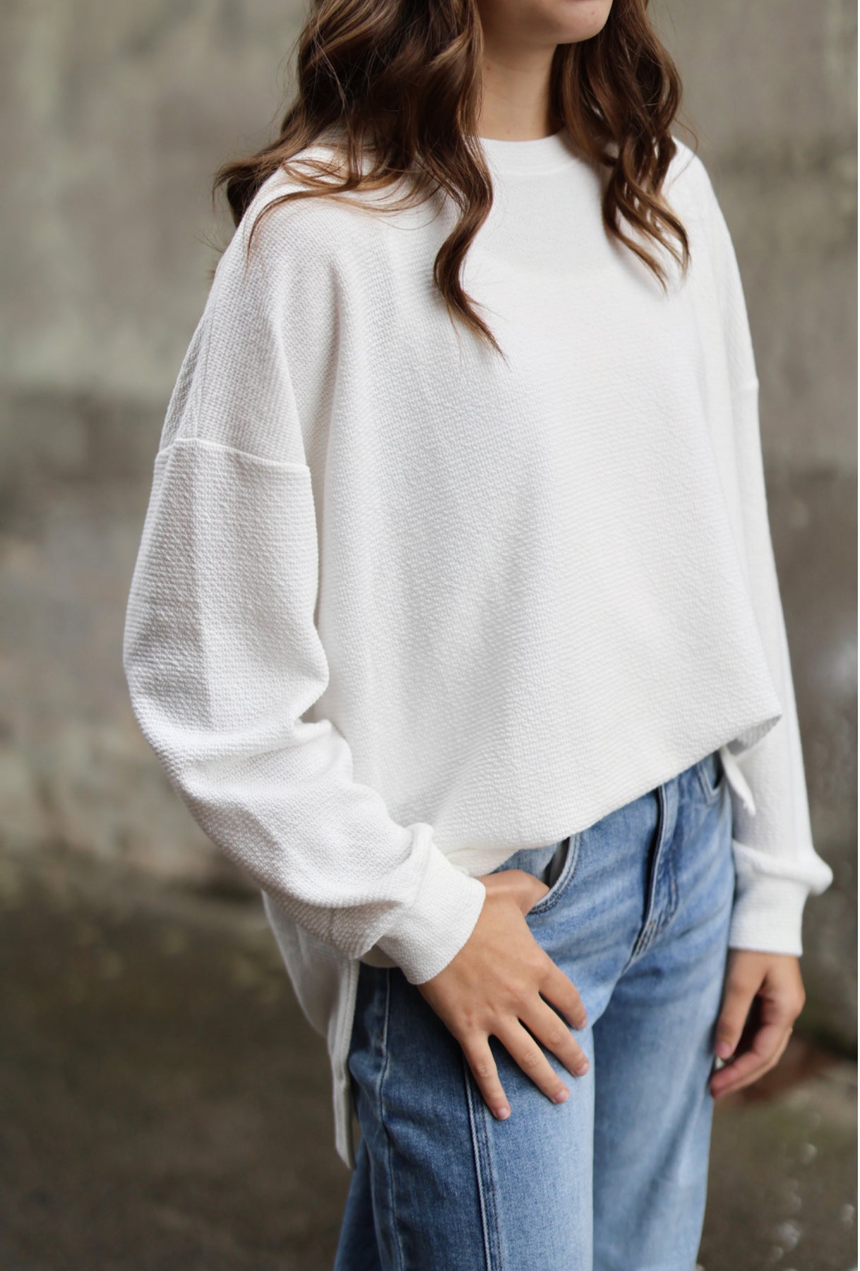 Soft, cozy, and effortlessly stylish—the Off-White Cloudy Knit Top is your new go-to. Designed with a dreamy ultra-soft knit, this long sleeve top features a relaxed longer length with side slits for easy movement and a flattering fit. Perfect for layering or lounging, it’s a versatile essential you’ll love to wear on repeat.