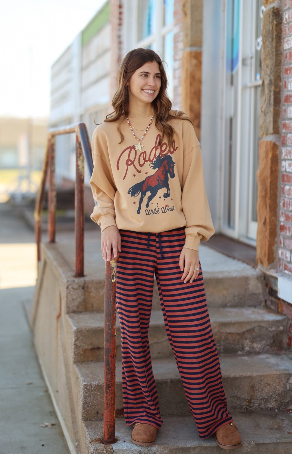 Bring western vibes to your everyday style with this caramel Rodeo sweatshirt. Featuring a bold rodeo graphic with a horse, this soft and comfy pullover is perfect for casual days, chilly nights, or throwing on after a long day. Made from 100% cotton, it’s as breathable as it is cozy.