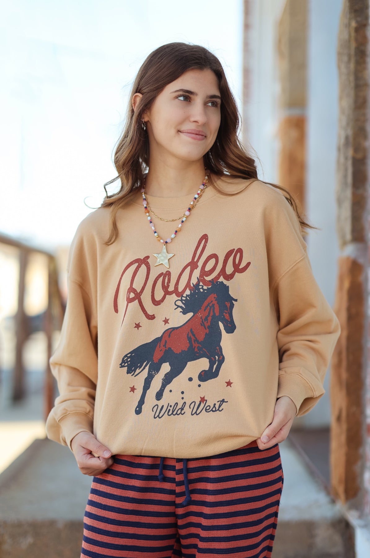 • Caramel-colored sweatshirt with western rodeo graphic and horse design
