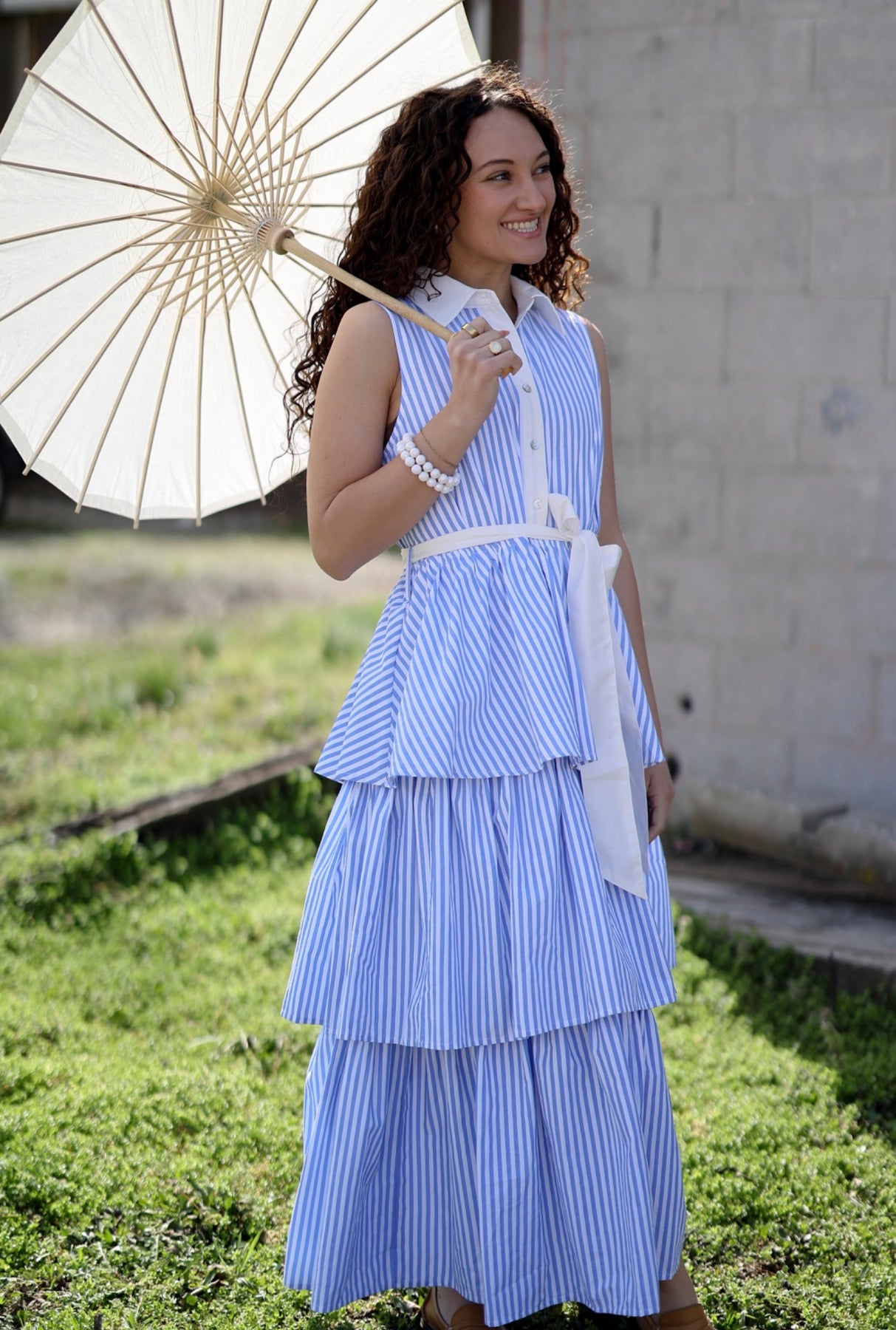Classic meets playful in this beautifully tailored striped midi dress by Entro. Featuring crisp blue and white stripes with a statement contrast collar, this piece brings a polished, vintage-inspired feel with a modern feminine twist. The tiered ruffle design adds soft movement and charm, while the waist tie creates a flattering, cinched silhouette that feels effortlessly put together.